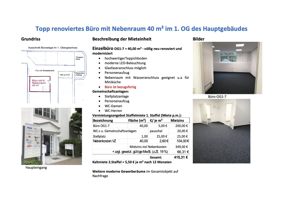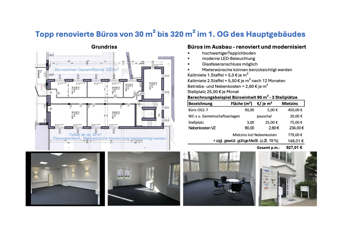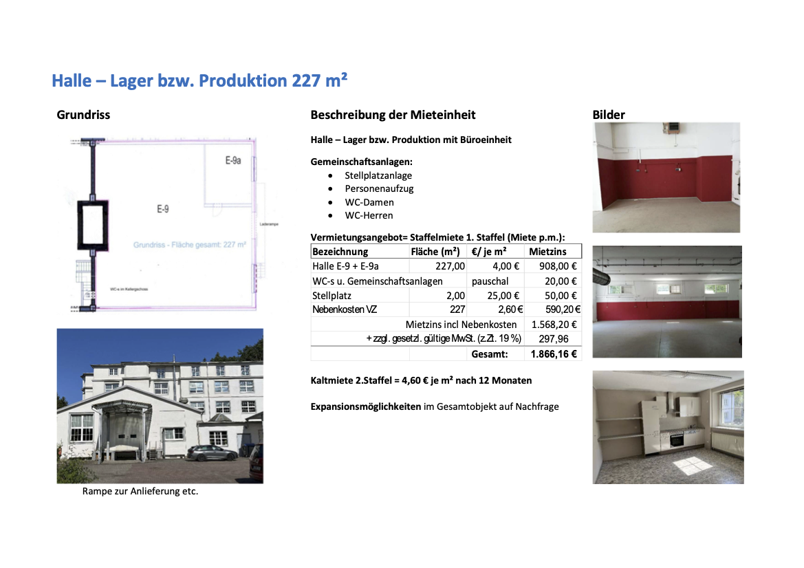 Mieteinheiten von 50 m² bis über 500 m². Dank solider Bausubstanz und hoher Traglast ideal für Handwerk, Produktion oder Büro.